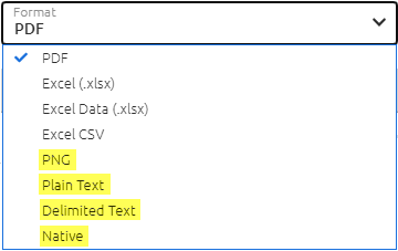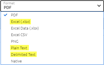 Supported formats for Crystal to SharePoint are PDF, Excel (.xls), Excel Data (.xlsx), Excel CSV, PNG, Native. The current HTML5 user interface version (2020.07.30) incorrect displays the following unsupported SharePoint formats: