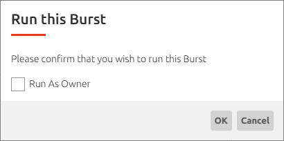 A Burst is a series of dependencies. Let’s say the Burst contains a WebI document with a SharePoint delivery. When the Burst is executed, credentials for the respective BusinessObjects and SharePoint Platforms are required. When a user runs a Burst, that user's Platform credentials are utilized. The ‘Run As Owner’ option gives an Administrator user the option to run the Burst as the user who created the Burst. If an Administrator user selects 'Run As Owner' and executes the Burst, then the Platform credentials of that Administrator user will be utilized. The option is not visible for non-administrator users.